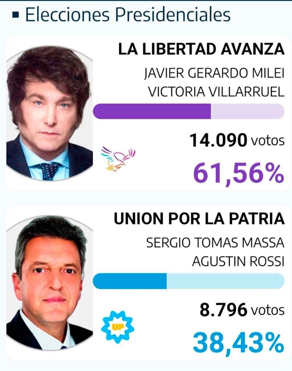 El candidato de La Libertad Avanza, obtuvo una diferencia considerable en todo el país, y Bolívar no fue la excepción. Se impuso prácticamente en todas las mesas del partido, logrando el 61.56% de los sufragios, contra el 38.43% de Sergio Massa. En la mayoría de las mesas lo superó ampliamente y la gente sumó el 75.45% de asistencia a las urnas, posicionándose en un término medio entre las PASO y las Generales.-