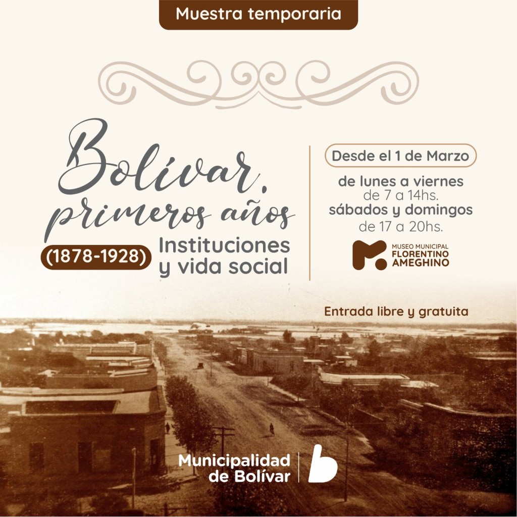 Será a partir del viernes 1 de marzo, en el marco del 146° aniversario de Bolívar, se podrá visitar en el Museo Municipal Florentino Ameghino la muestra temporaria “BOLÍVAR, PRIMEROS AÑOS” (1878-1928) instituciones y vida social.-