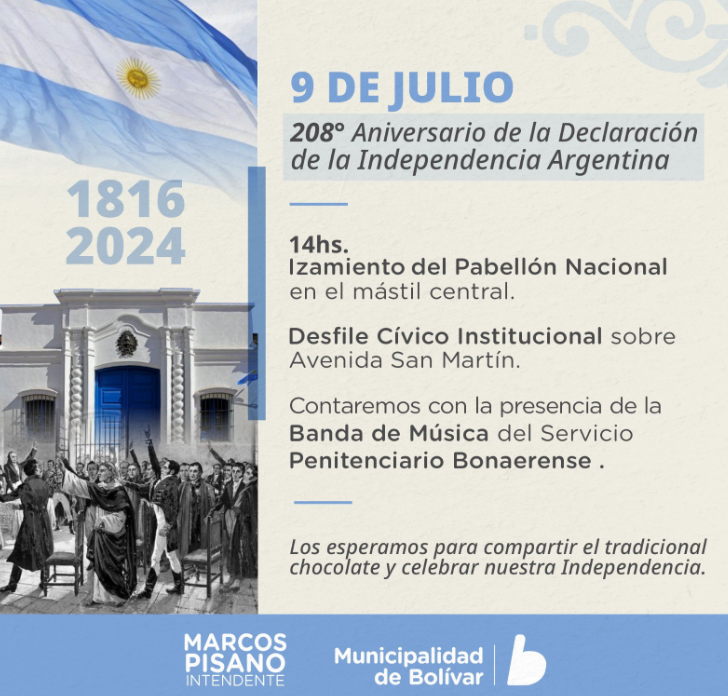 Con la participación de instituciones educativas e intermedias del Partido de Bolívar, la gestión municipal a través de la Dirección de Cultura, organiza el acto y desfile cívico-institucional para celebrar el 208° aniversario de la Declaración de la Independencia Argentina.-