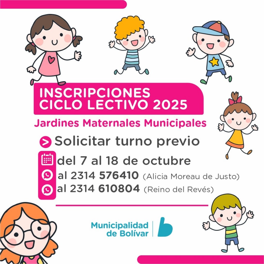 La Municipalidad de Bolívar informa que desde el 7 al 18 de octubre inclusive, permanecerá abierta la inscripción para el ciclo lectivo 2024 del jardín “Alicia Moreau de Justo” y “El Reino del Revés”.