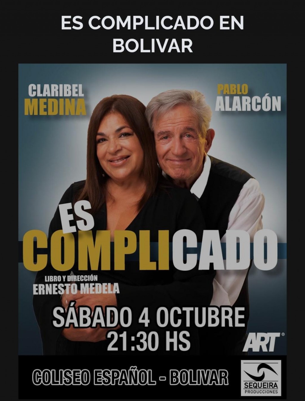 "Es Complicado" surge del libro de Ernesto Medela, y cuando Claribel Medina y Pablo Alarcón deciden trabajar juntos, se dieron cuenta que estaba escrita como si fuera para ellos. Se presentarán este sábado 4 de octubre a las 21.30 en el teatro Coliseo Español.-