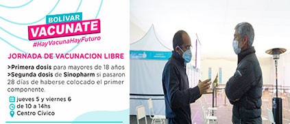 Con la llegada de 3300 nuevas dosis de AstraZeneca continúa agilizadamente la Campaña de Vacunación en el distrito. El equipo de Salud estará vacunando de manera libre con primeras dosis a mayores de 18 años y segundas dosis de Sinopharm- pasados los 28 días de la primer inoculación - en el Vacunatorio Móvil que se ubicará este jueves 5 y viernes 6, de 10 a 14hs, en el Centro Cívico.