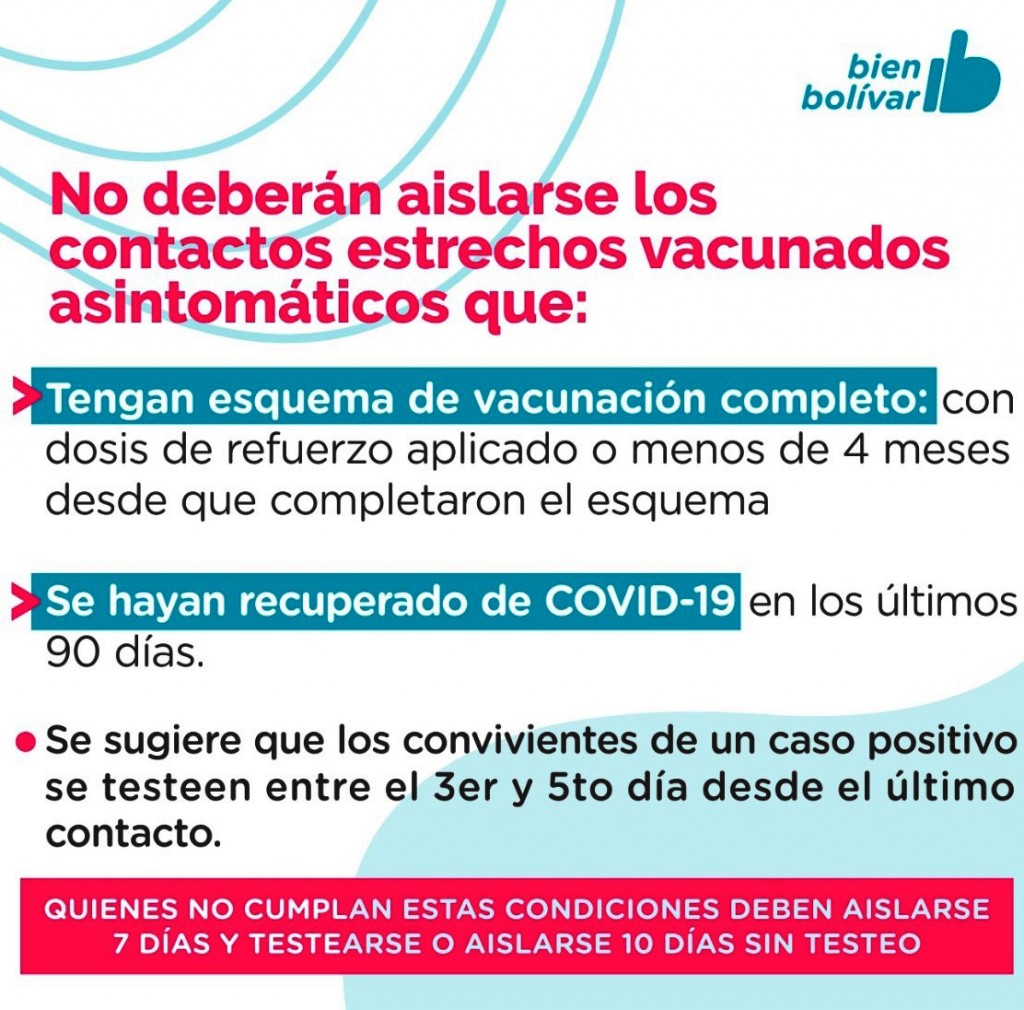 De acuerdo a las nuevas disposiciones anunciadas por el Gobierno Provincial, el Municipio de Bolívar adhiere al cambio de protocolo en el aislamiento para los contactos estrechos