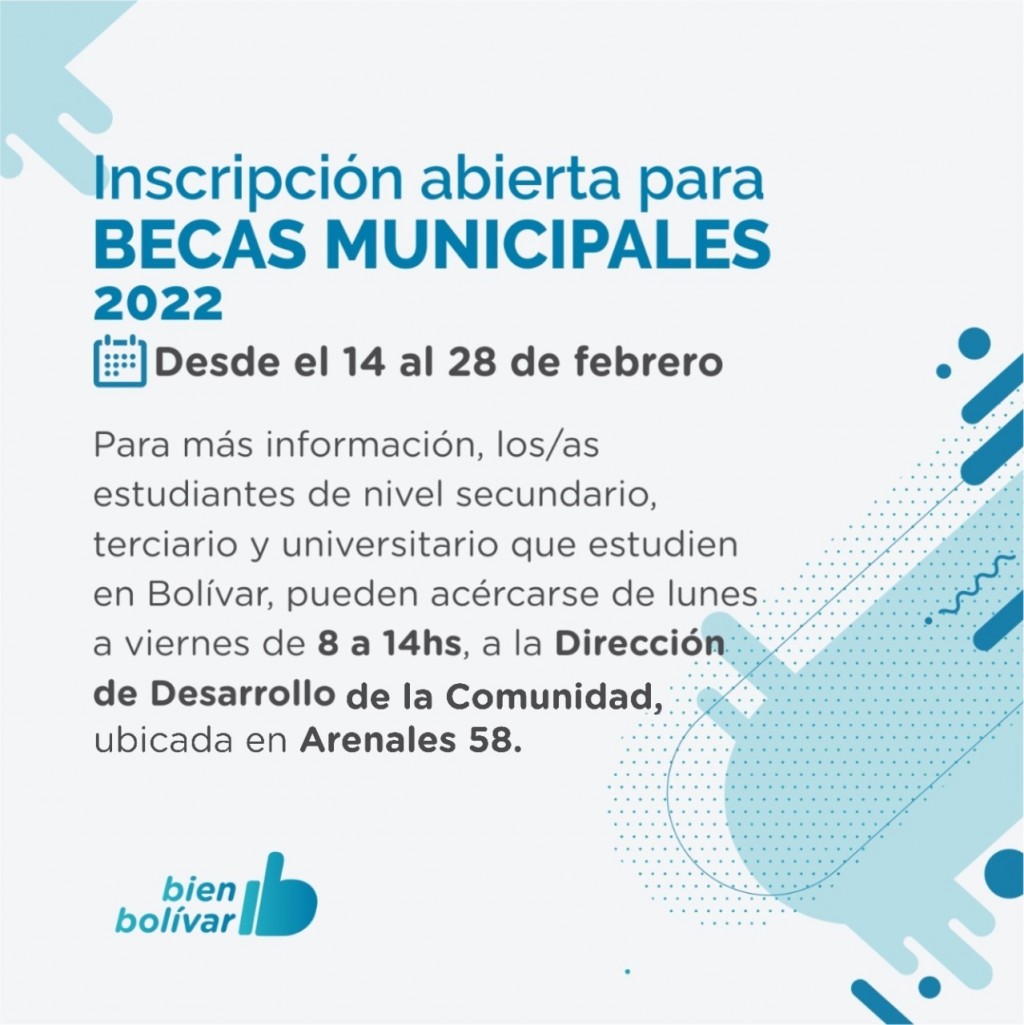 El programa de becas municipales, que consiste en otorgar un aporte económico mensual, está destinado a aquellos/as bolivarenses que cursen sus estudios de nivel educativo secundario, terciario y universitario en la localidad.