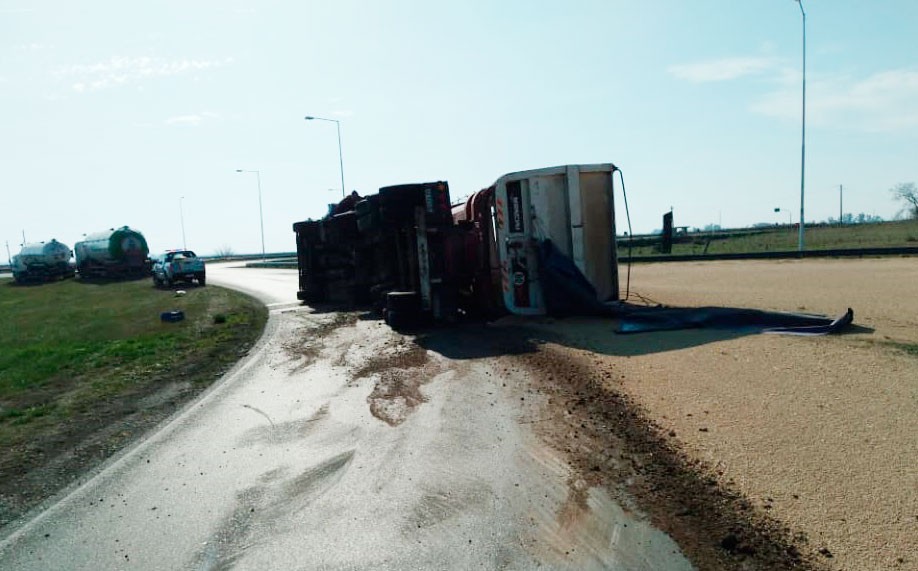Rotonda rutas 205 y 65: Volcó un camión con un semirremolque batea cargado de cereal