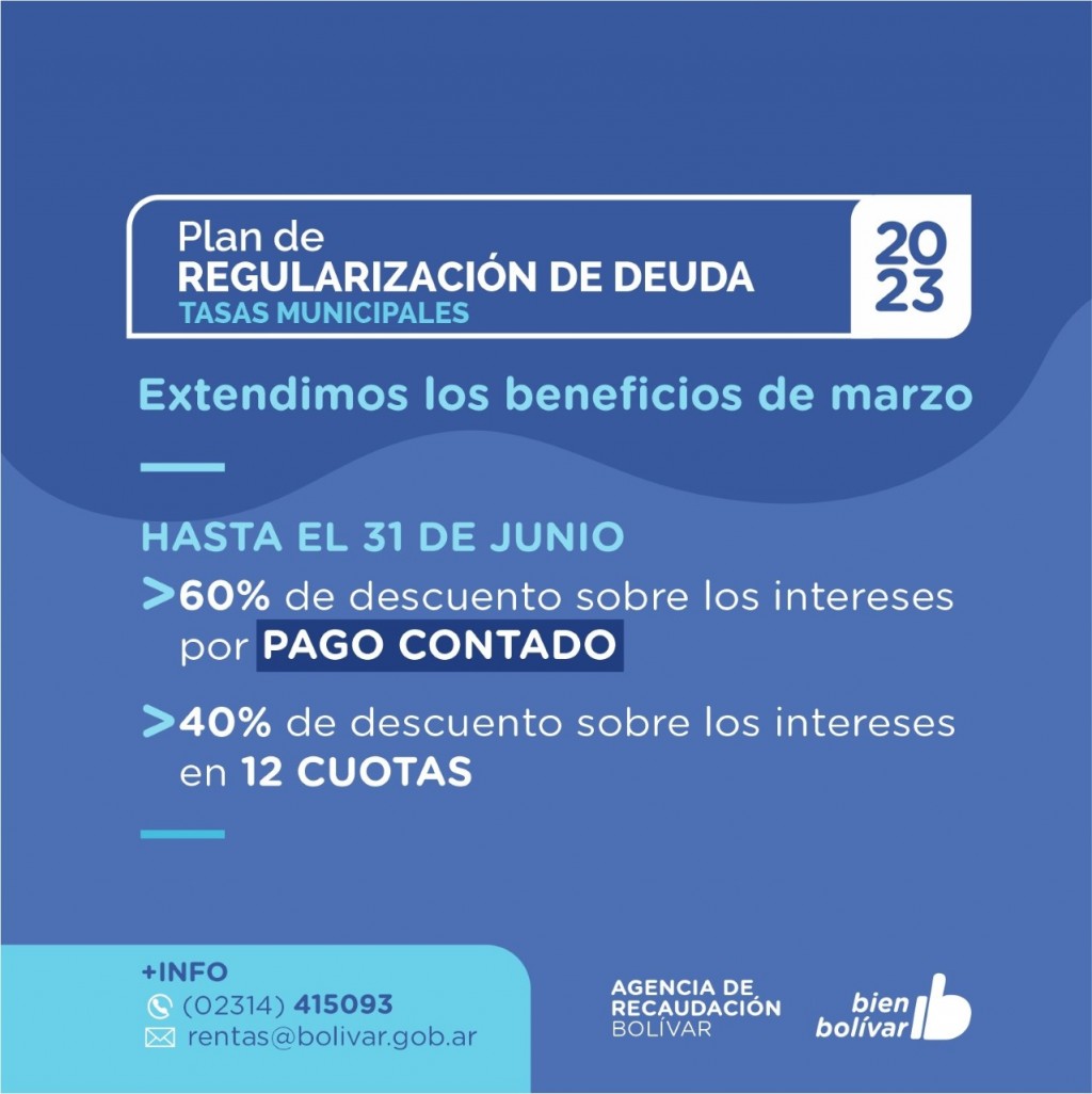Los y las contribuyentes que posean deudas en las tasas municipales pueden realizar el pago con descuento en la Agencia de Recaudación Bolívar. Hasta el 30 de junio por pago contado se realizará un 60% de descuento sobre los intereses; y el plan de 12 cuotas tendrá una bonificación del 40% de descuento.