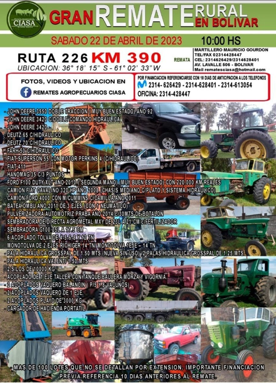 El predio del remate está ubicado en ruta nacional 226, al kilómetro 390, y el comienzo está previsto para las 10 de la mañana de este sábado 22 de abril.