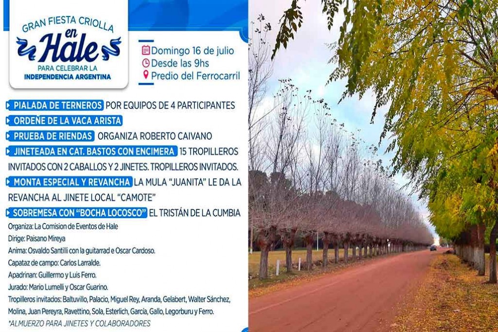 La localidad de Hale celebrará la Independencia con una Fiesta Criolla que tendrá lugar el domingo 16 de julio, desde las 9hs en el Predio del Ferrocarril.-