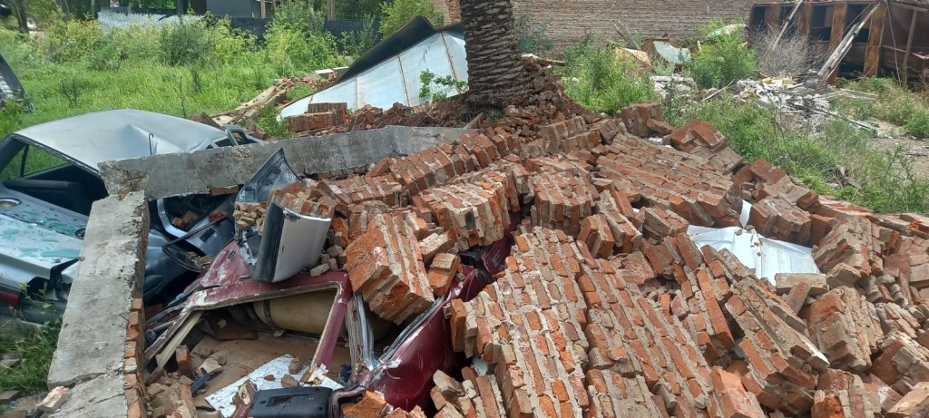 En contacto con FM 10, nos manifestaron que si bien existen varios emprendimientos que justifican puestos de trabajo y eso es muy valioso, hay sectores que implican mucho riesgo para quienes transitan en cercanías. Cabe destacar que el fuerte viento del temporal de este sábado, ocasionó la caída de paredes y vigas como muestran las imágenes.-