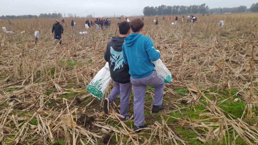 Terminan de juntar a mano, y se hace un repaso por si quedó algo, después van a comer unos choripanes y compartimos un momento lindo en el almuerzo. Siempre se deja una hectárea, que es lo que habitualmente se hace a mano entre todos. Como siempre decimos, una jornada solidaria, en la que participan no solo estudiantes, sino también varias instituciones, vemos obreros, vemos ambulancias.
