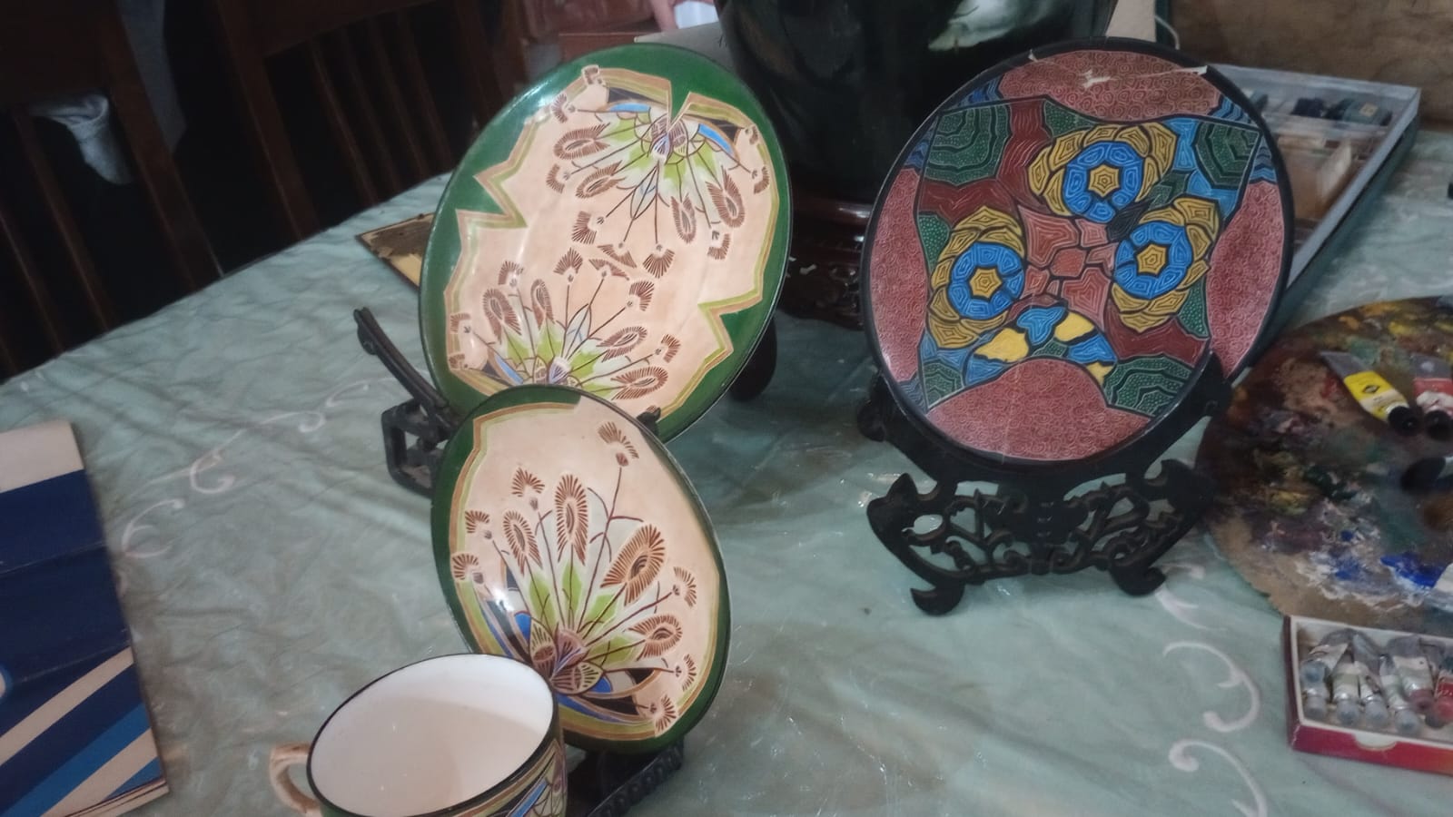 Y vas a ver todo lo que fue, yo lo compré en la primera barata del Asilo de Ancianos porque ellas estaban en la primera comisión del asilo de ancianos. Entonces vas a ver un ventilador, una mesa de luz, la cama, los bastones y las sillas que pertenecieron a la primera compra que hice en el Asilo de Ancianos. Cada rama, digamos, para donde dispare la pintura de la pared, abajo están los objetos relacionados con esta persona.
