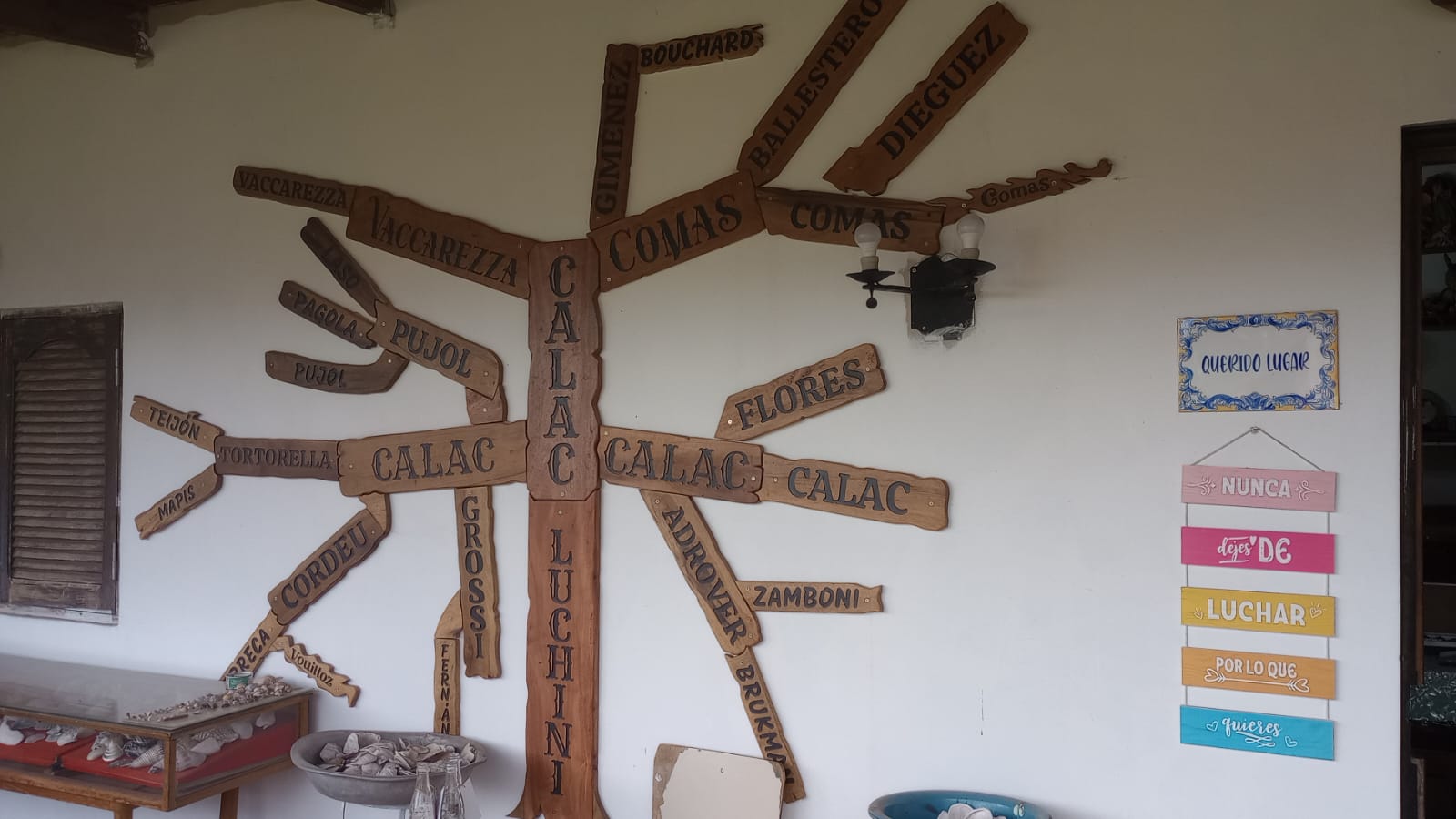 “Esto comenzó con algo que pintó mi hermana Gabriela, que es el árbol genealógico. Ah, bien, el árbol genealógico lo pintó Gabriela, comienza acá, ves, es un árbol, para que la gente vaya recreando, es en la pared, es una pintura de un árbol, donde en la raíz del árbol están las fotos”