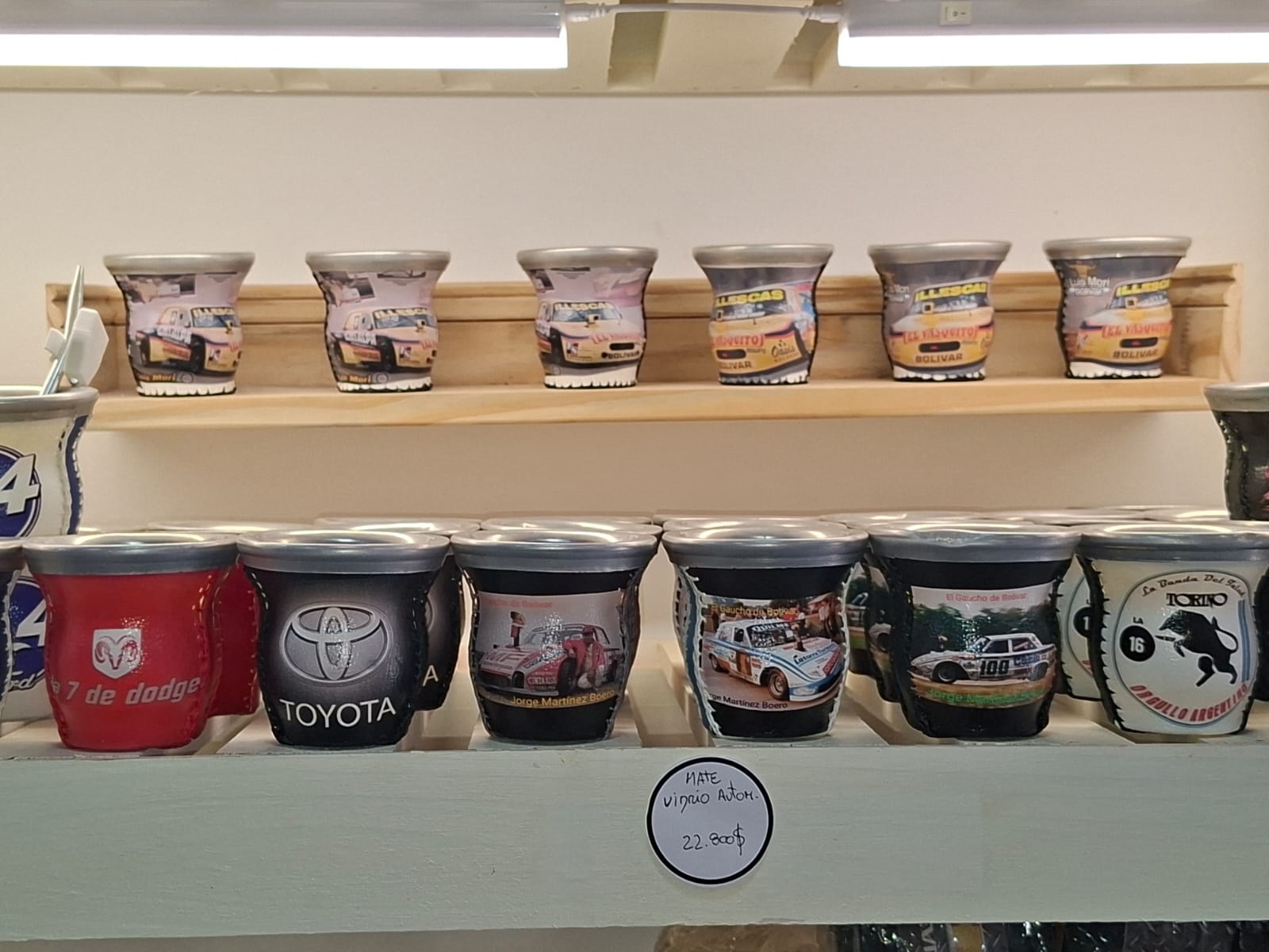 Réplica de cascos en miniatura, tenía de uno de los más grandes que se fue hace poco, Juan María Traverso, de Ayrton Senna. Mandamos hacer exclusivamente unos mates de vidrio forrado, impresos de Luis Mori un piloto bolivarense. Pelotitas en miniatura de los personajes también, acolchados, sábanas, toallones, alfombras, todo hablemos de fanáticos. Después termeras, yerberas, y las clásicas remeras de Chevrolet, Ford, River, Boca. Además, mochilas, botineros y llaveros.