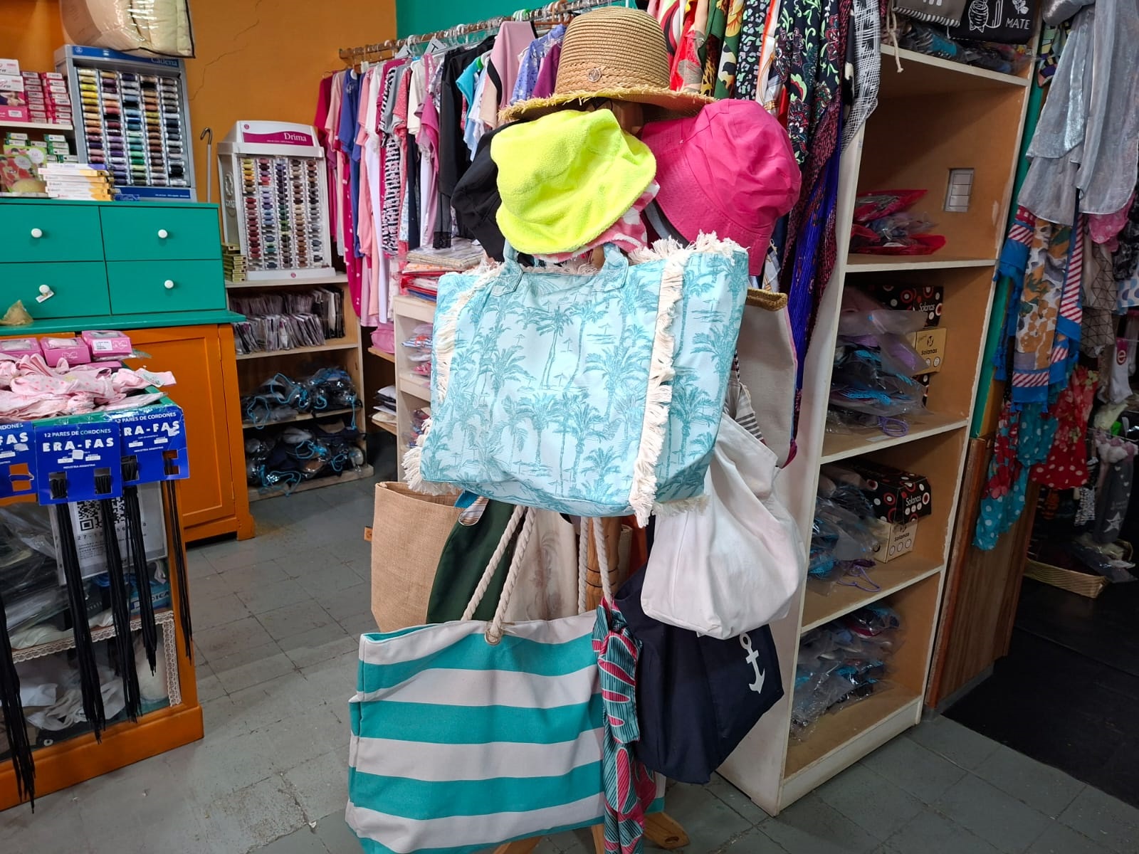 En mercería lo que tenemos es lo básico, no nos extendemos mucho porque no es el fuerte nuestro, pero sí todo lo básico como el elástico, hilos, cierres, todo eso sí lo trabajamos porque es un complemento.