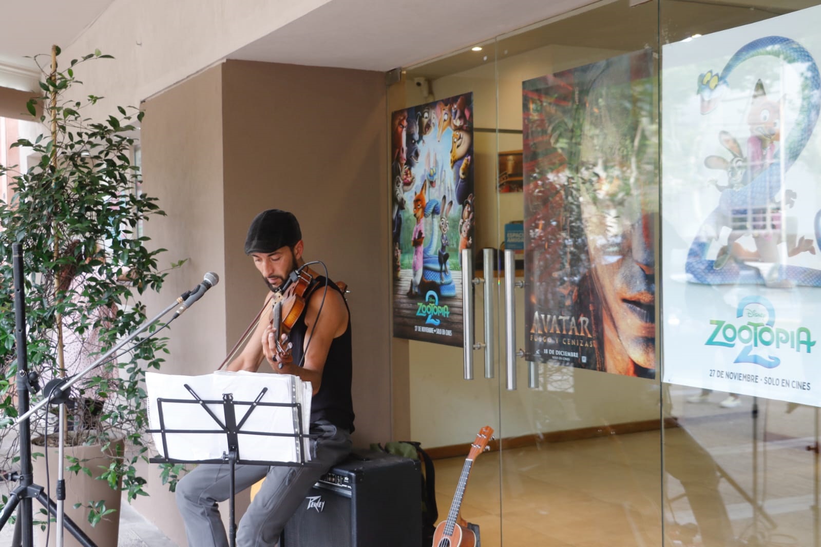 Minutos antes de la primera función, el público fue recibido con una propuesta especial que incluyó música en vivo a cargo del violinista Diego Peris, pintura de caras para niños y niñas, y un espacio para fotografías junto a los posters de la película, generando un clima de festejo y encuentro.