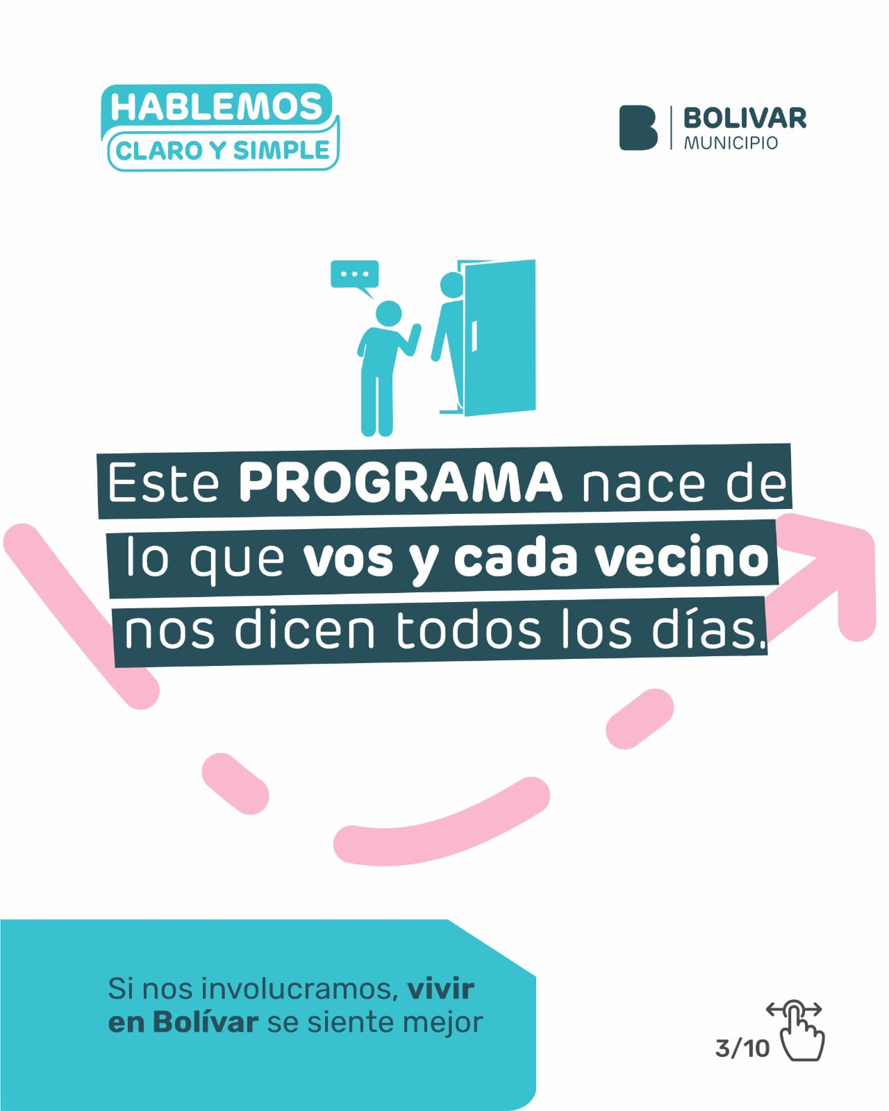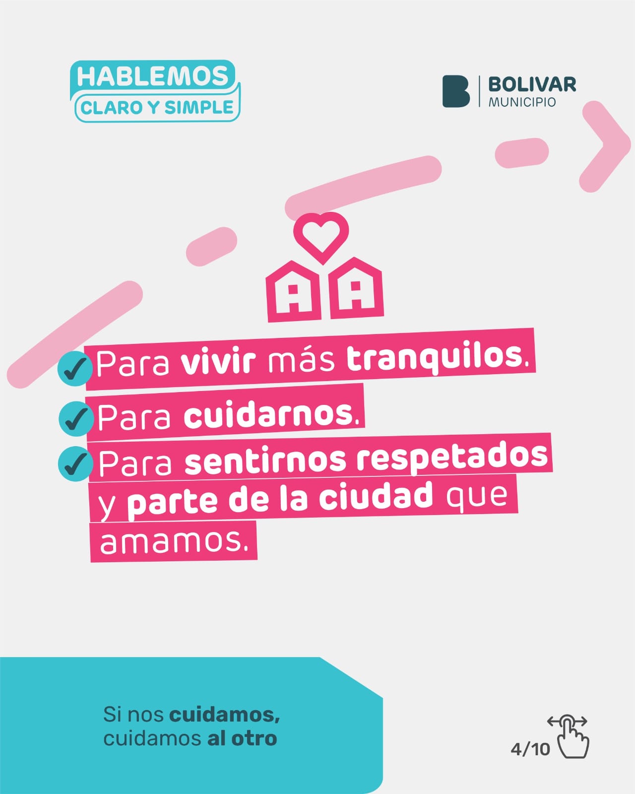 La Municipalidad de Bolívar continúa impulsando el programa “Hablemos claro y simple”, una iniciativa del intendente Eduardo Bali Bucca que se desarrolla en todo el Partido de Bolívar con el objetivo de fortalecer las normas de convivencia y promover la responsabilidad individual y colectiva en la vida cotidiana.-