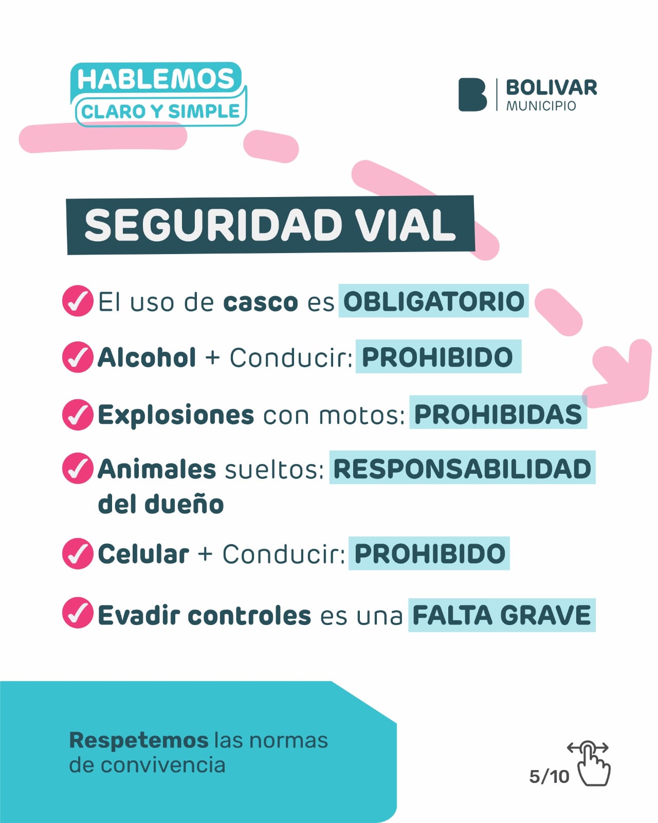 En materia de seguridad vial, se recuerda la obligatoriedad del uso del casco, la prohibición de conducir bajo los efectos del alcohol o utilizando el celular, realizar maniobras peligrosas con motos, evadir controles y circular con animales sueltos, siendo estos últimos responsabilidad exclusiva de sus dueños.