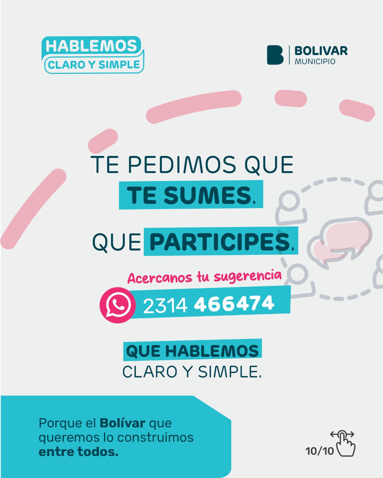 Finalmente, desde el Municipio se invita a toda la comunidad del Partido de Bolívar —vecinos y vecinas de la ciudad cabecera y de localidades— a sumarse, participar y acercar sugerencias. “Hablemos claro y simple” es un programa que surge de lo que los vecinos expresan día a día, con la convicción de que el Bolívar que queremos se construye entre todos.