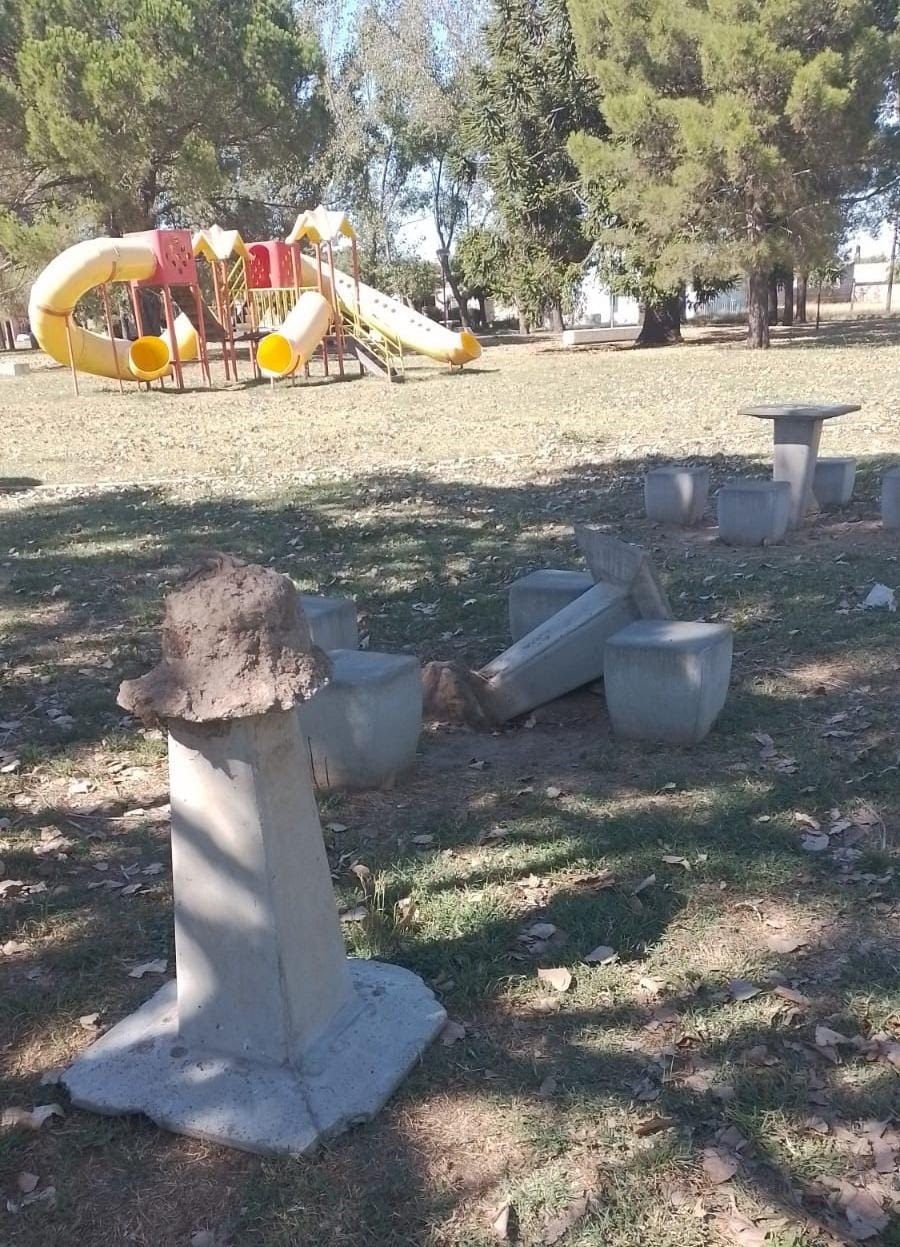 En el lugar trabajadores municipales encontraron mesas y bancos de cemento dañados.