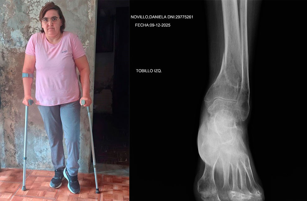 Era un dolor fuertísimo, que no me dejaba caminar, no me dejaba dormir, los antibióticos que tomaba no me hacían efecto y ya no me hace nada efecto. Me hice ver con un médico en Azul, que es el que me está tratando en este momento, me hace una Tomografía completa y tengo el tobillo fuera de lugar, dos fracturas de tibia y el peroné abierto en 3 milímetros, a lo que me dejaron pasar sin operarme.