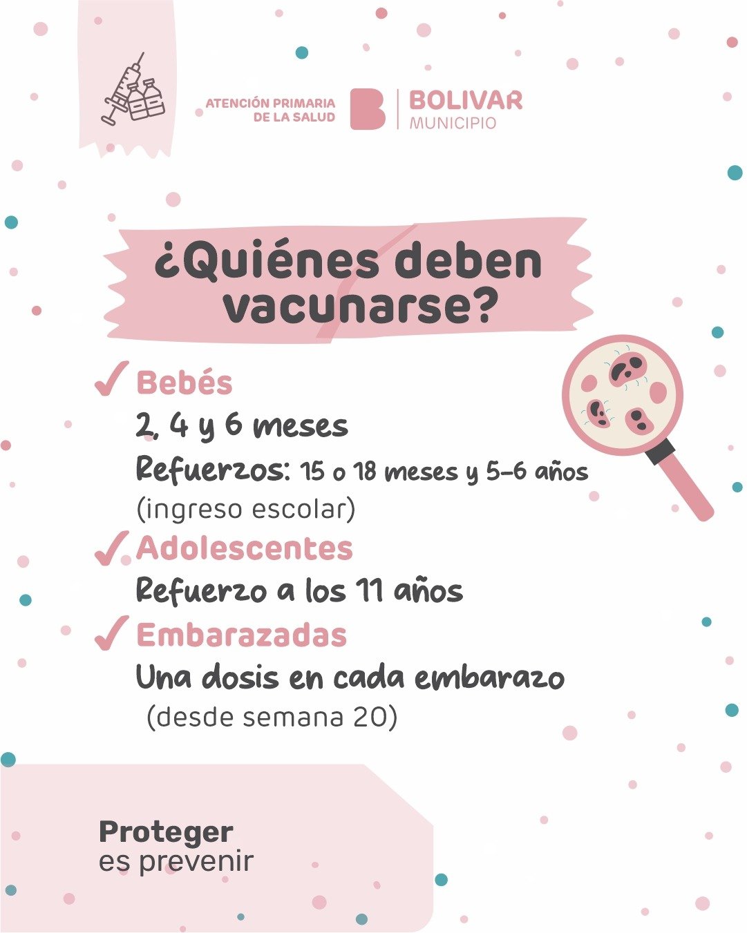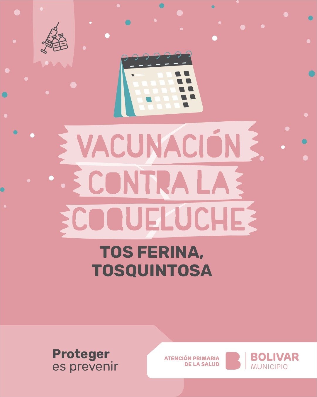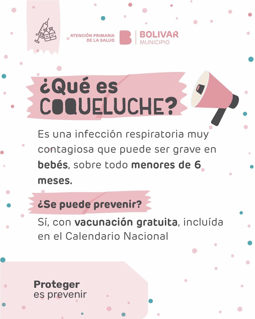 Bajo el lema "Proteger es prevenir", el Municipio a través del área de Atención Primaria de la Salud, informa a la comunidad sobre la importancia de mantener actualizado el Calendario Nacional de Vacunación para prevenir la Coqueluche, también conocida popularmente como tos ferina, tos convulsa o tosquintosa.-