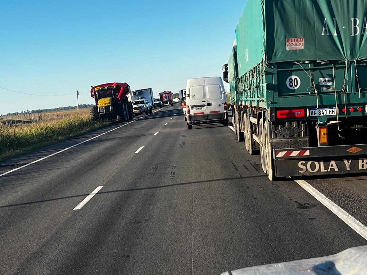 Un hombre conducía un camión Fiat Iveco con dominio colocado AF 288 EX. Por otra parte, un productor conducía un equipo de maquinaria agrícola.