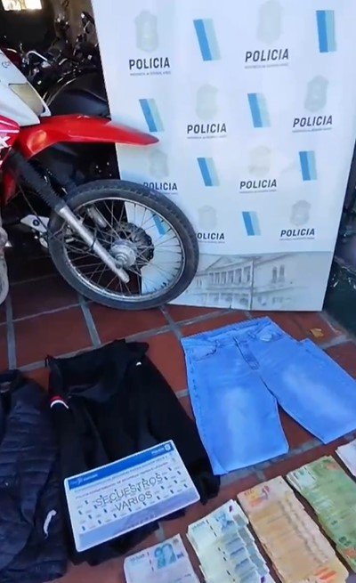 Tras ser reducido, se procedió al secuestro de la suma de $ 4.440.800, provenientes del ilícito cometido en Juan José Paso, más un arma de fuego tipo pistolón marca Centauro calibre 24 y una réplica de pistola calibre 9mm, dos frascos que contenían sustancia compacta (Marihuana) y una motocicleta marca Triax 150 de colores rojo y blanco, sustraída recientemente.