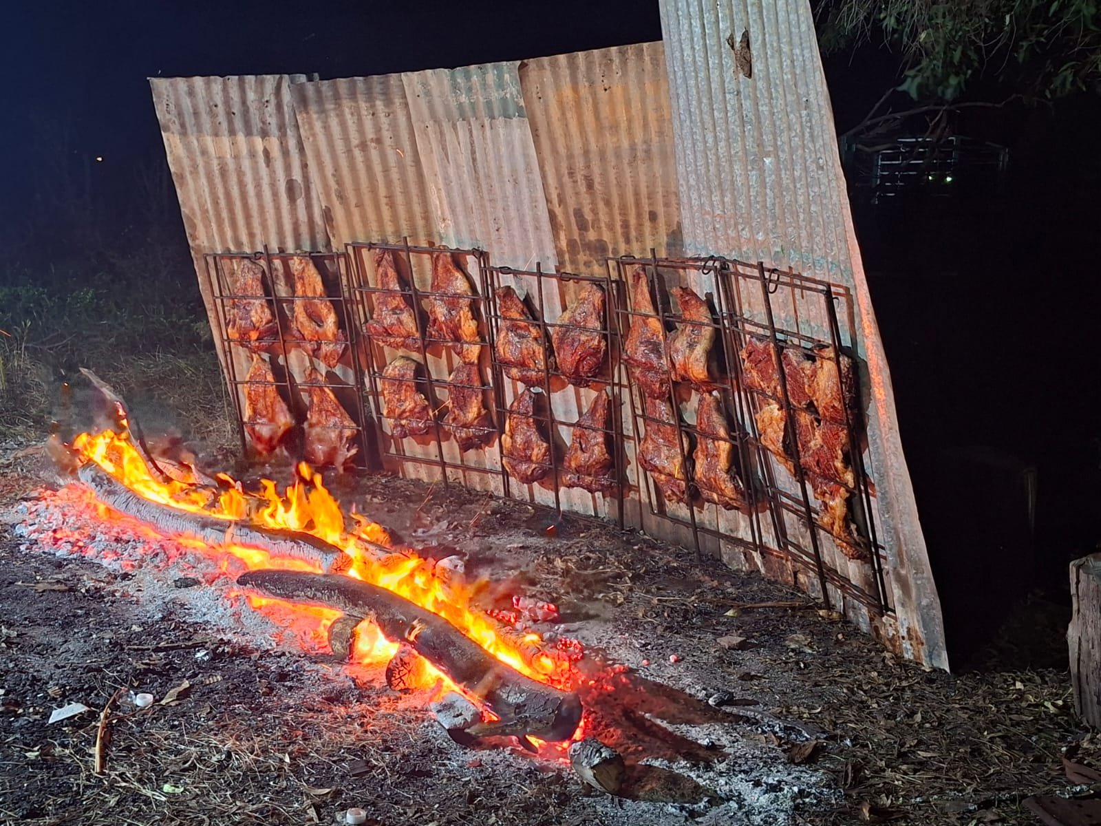 Primero se comenzó con el asado con cuero, que se presenta acompañado por salsa tártara y ajíes amarillos, luego sigue la noche con la clásica tapa de asado caliente, nunca faltan todas las bebidas ni tampoco el helado. Pero más tarde aparacen los termos con café y bombones.