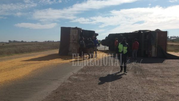 En el lugar trabajan Bomberos, Policía Vial y Defensa Civil, recolectando el cereal esparcido sobre el asfalto, por lo que el transito es asistido por camino alternativo del lugar.