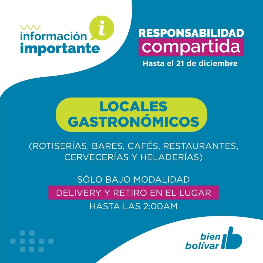 Además, se suspenden las actividades nocturnas, y los locales gastronómicos (rotiserías, bares, cafés, restaurantes, cervecerías y heladerías) deberán trabajar con modalidad delivery hasta las 02 am o retiro en el local.