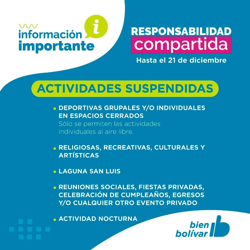 También quedan inhabilitados las actividades religiosas, recreativas, culturales, artísticas, las reuniones sociales, los egresos, las celebraciones de cumpleaños y todo evento de índole privado.