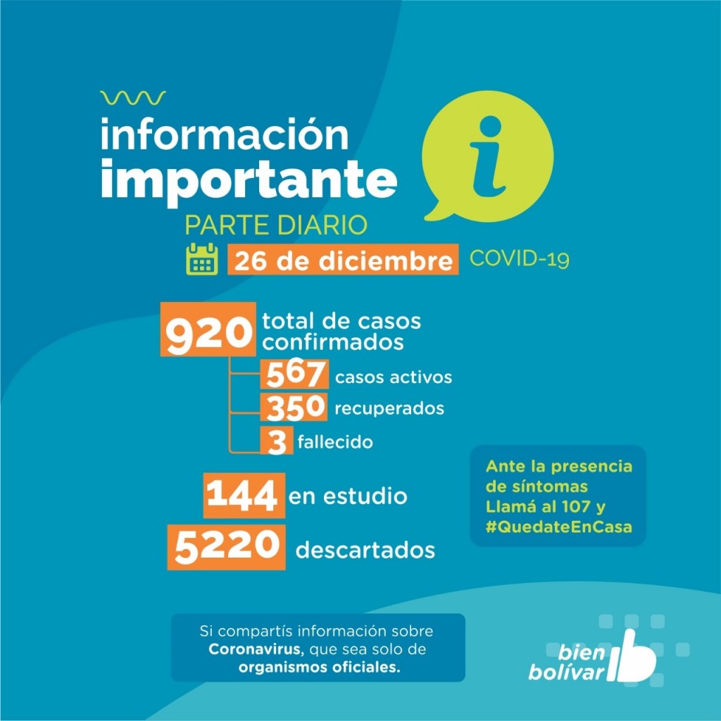 La información que ingresa desde la Oficina de Prensa Municipal indica que los pacientes ya fueron dados de alta este 26 de didiciembre. Por otra parte, se analizarán 144 muestras en el Laboratorio de Biología Molecular Bolívar.-