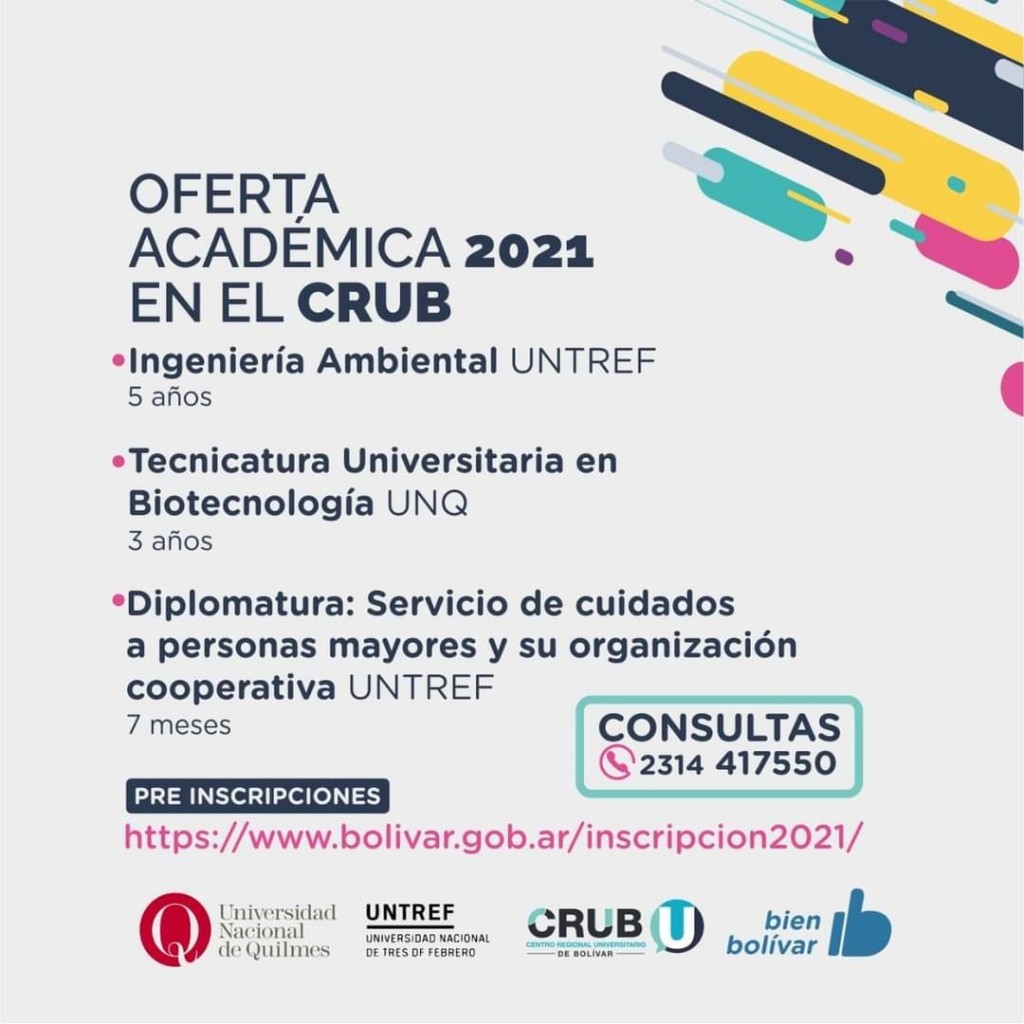 Las carreras Ingeniería Ambiental y Diplomatura de Servicio de Cuidados a Personas Mayores y su Organización Cooperativa de la UNTREF, y la Tecnicatura Universitaria en Biotecnología de la Universidad Nacional de Quilmes forman parte de la nueva oferta académica 2021 del Centro Regional Universitario para Bolívar y la región.