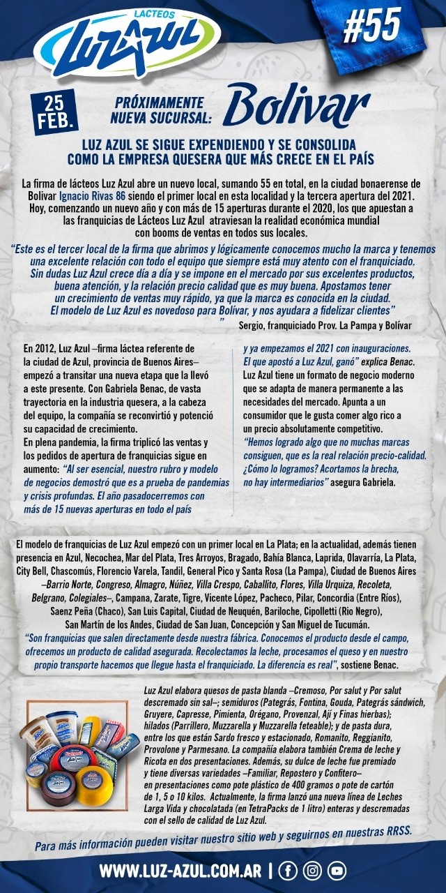 La firma abre su local n°55 en Ignacio Rivas 86, y se extiende con un sistema de franquicias muy exitoso. Durante el año 2020 las aperturas fueron 15 en distintos puntos del país, y la de Bolívar, es la tercera apertura del 2021.-