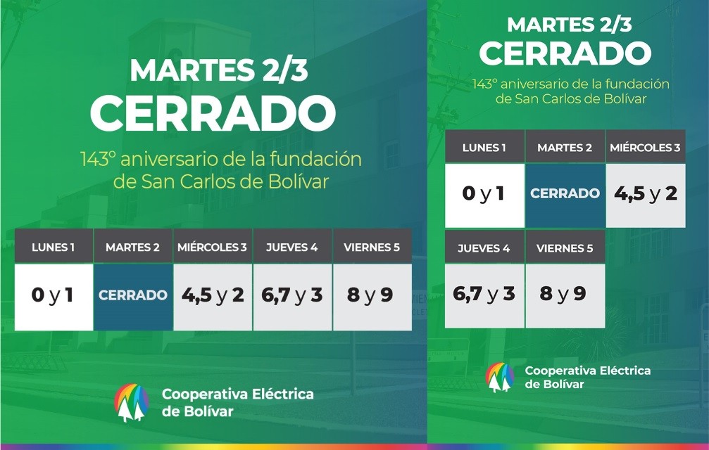 Con motivo de celebrarse el día martes 2 de marzo el 142º Aniversario de la fundación de San Carlos de Bolívar, las oficinas permanecerán cerradas el mismo día.