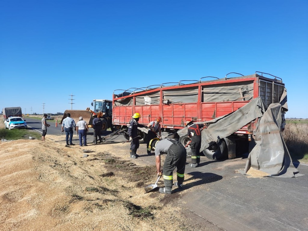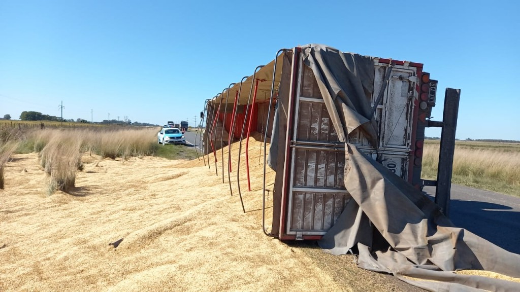 Al parecer uno de sus neumáticos se habría “calzado” en una de las recientes reparaciones, lo que hizo que se diera vuelca sobre la cinta asfáltica volcando su carga de avena.-
