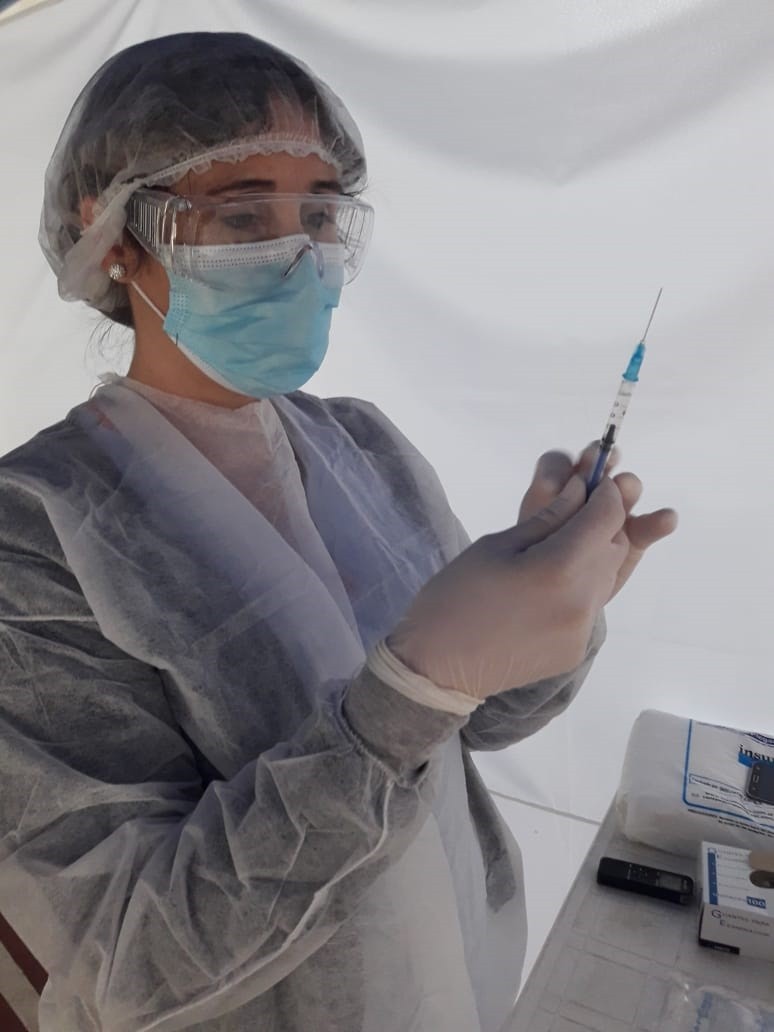 Durante la jornada del pasado viernes, Silvina es parte del equipo de trabajo de Radio Urdampilleta, pero también cumple una importante función en la Campaña de Vacunación contra el COVID19 que se está desarrollando en el Gimnasio Municipal.-
