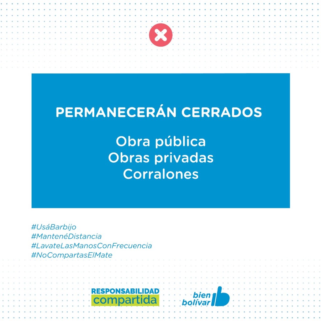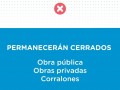 Se prohíbe la permanencia en los espacios públicos y quedarán cerradas las obras públicas, privadas y los corralones. Asimismo, se suspenden las ferias agropecuarias y artesanales.