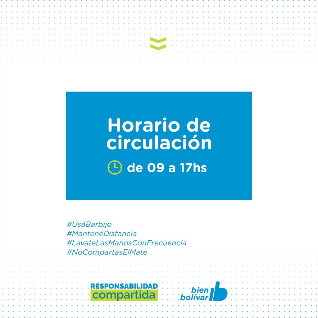 Regiran desde el primer minuto del sábado y tendrán vigencia hasta el domingo 23 de mayo. Se establece que el horario de circulación será de 9 a 17 horas; y que las actividades comerciales permitidas para su funcionamiento son las de rubro alimenticio, farmacias, atención en consultorios médicos, ópticas, expendio de combustibles, gomerías y talles para auxilios y emergencias.-