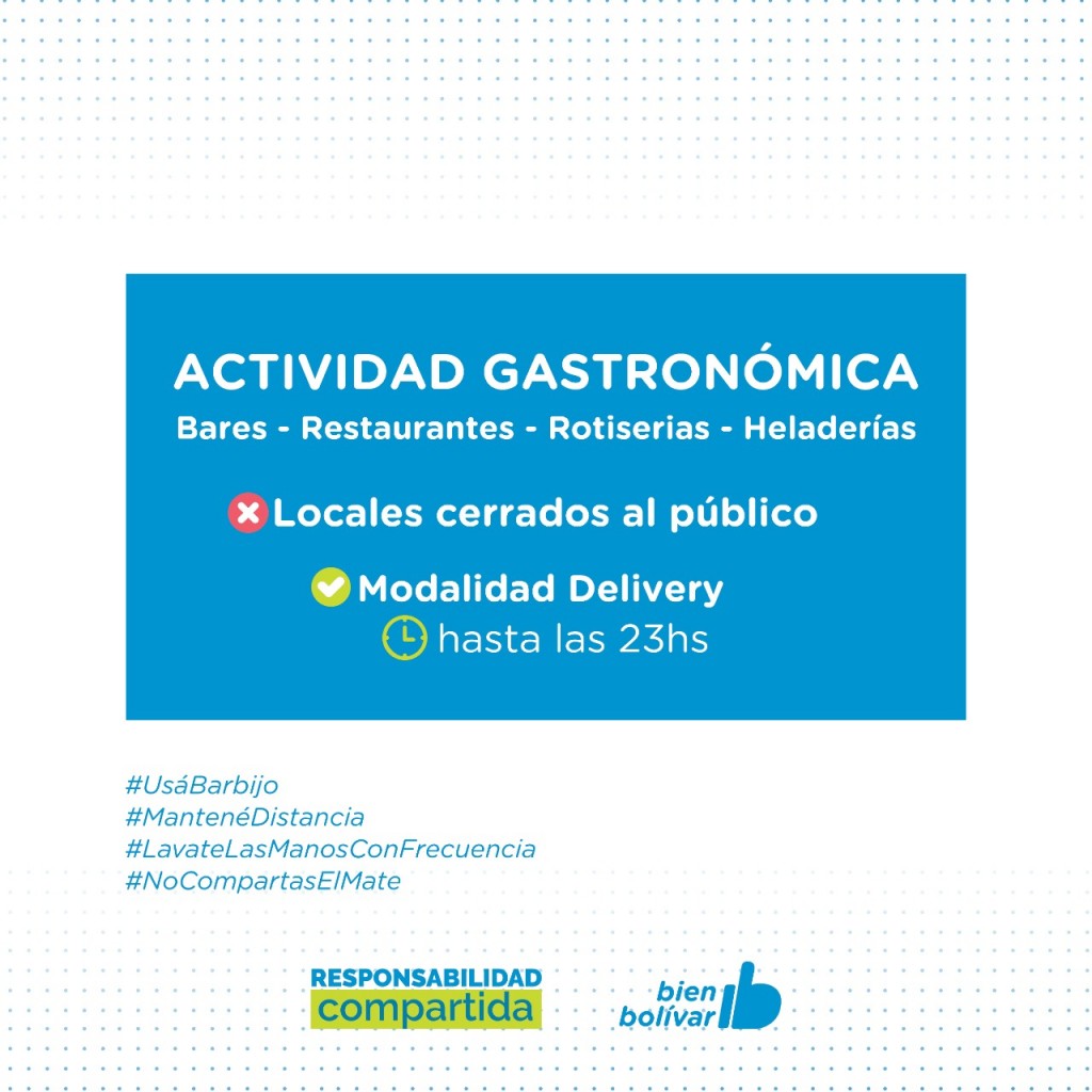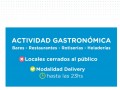 Además, las actividades gastronómicas como bares, restaurantes, rotiserías y heladerías deberán permanecer cerradas al público y trabajar bajo modalidad delivery hasta las 23 horas.