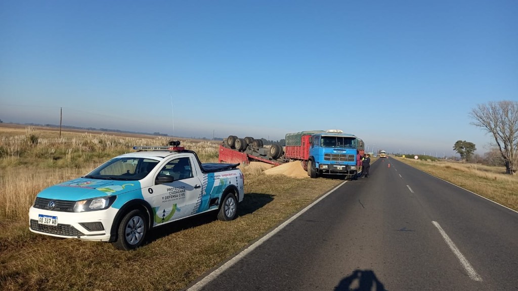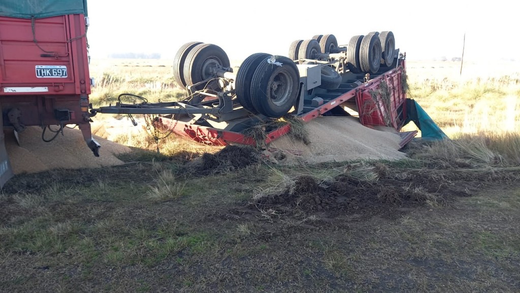 Un camión que transportaba cereal, terminó volcando su remolque a pocos metros de la rotonda rutas 205 y 65
