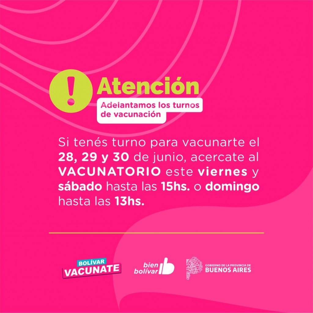 Los turnos previos generados para la próxima semana fueron adelantados para los días viernes 25 y sábado 26 de 9 a 15hs y el domingo 27 de 9 a 13hs en el Centro Vacunatorio. Las personas con turno asignado del 28 al 30 de junio podrán asistir este viernes, sábado o domingo para recibir su dosis en el horario estipulado y se solicita a la comunidad revisar los canales de comunicación declarados al momento de la inscripción para no perder el turno.