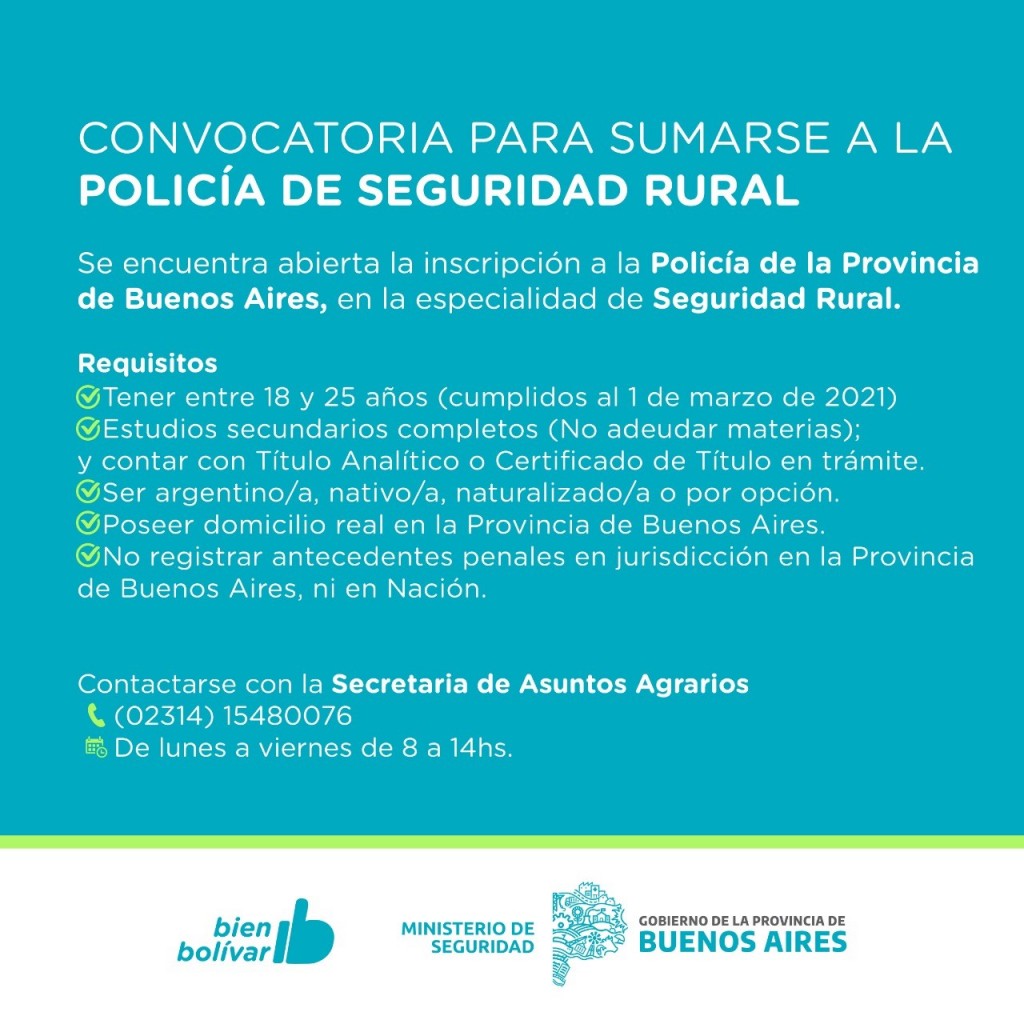 Para la figura de Policía Rural, es requisito tener entre 18 y 25 años -cumplidos al 1 de marzo de 2021- estudios secundarios completos y no poseer antecedentes.-