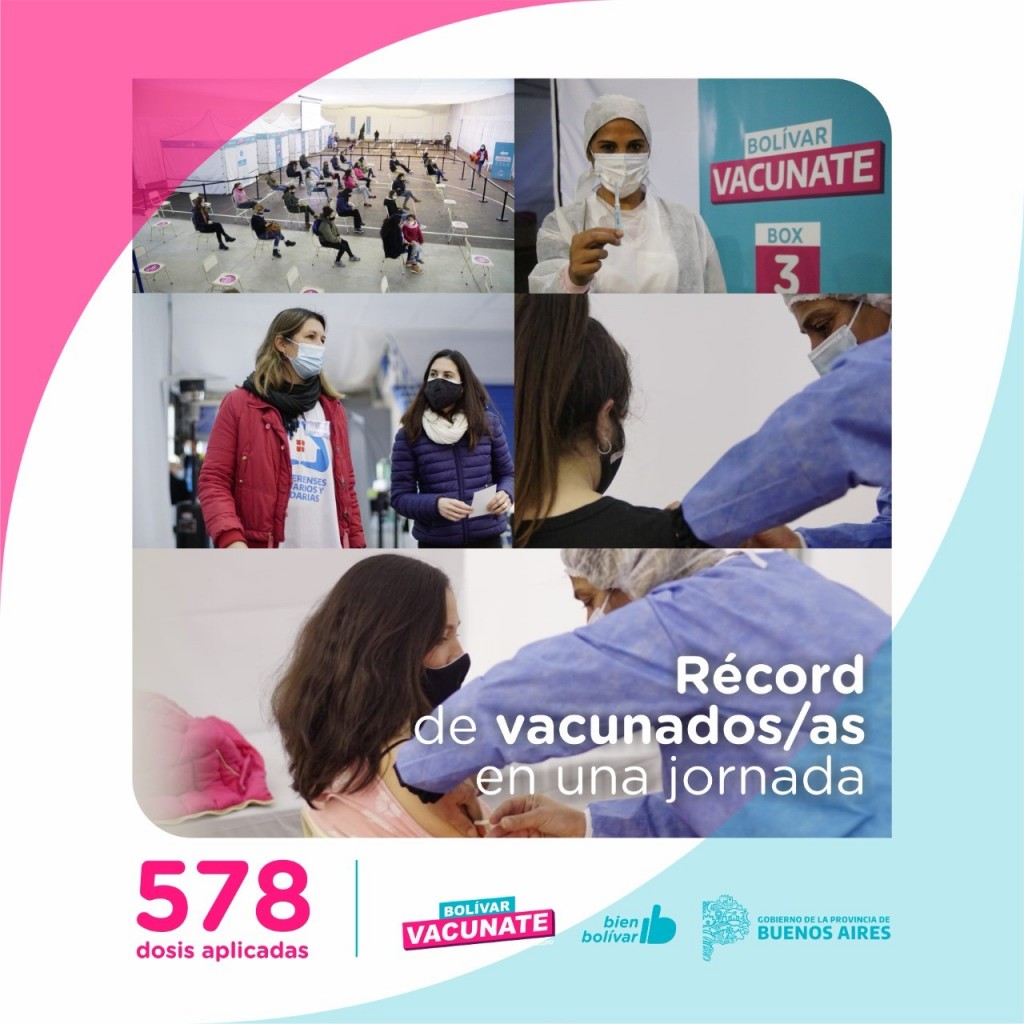 Durante la jornada de este martes se alcanzó una cifra récord de dosis aplicadas en Bolívar, en la que fueron vacunados 578 bolivarenses  registrados en el Plan Provincial de Vacunación, y aquellas personas que se presentaron de manera espontánea y pertenecen a los grupos priorizados en esta nueva etapa.