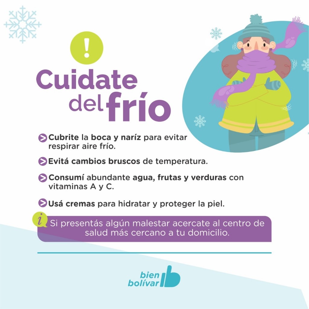 LA MUNICIPALIDAD BRINDA RECOMENDACIONES ANTE EL PRONÓSTICO DE UNA NUEVA OLA POLAR EN LA PROVINCIA La temperatura mínima más baja pronosticada para esta semana será de - 6 grados y tendrá lugar este miércoles. La Municipalidad brinda recomendaciones específicas a tener en cuenta para enfrentar la nueva ola polar. El Servicio Meteorológico Nacional alertó sobre el frío polar más importantes de está temporada invernal. Bolívar, Carlos Casares, Carlos Tejedor, Hipólito Yrigoyen y Pehuajó forman parte del área que será afectada por bajas temperaturas, que oscilarán por debajo de valores normales, al menos hasta la mañana del jueves 29. Se espera que las temperaturas mínimas estén entre - 6 °C y 6 °C, mientras que las temperaturas máximas oscilarán entre 10 °C y 17 °C. En consecuencia, por las bajas temperaturas, la Gestión Municipal recomienda tomar abundante cantidad de líquido, consumir frutas y verduras con Vitamina A y C; mantener las normas de higiene para evitar el contagio de enfermedades respiratorias, cubrirse la boca y la nariz; mantener los ambientes ventilados para evitar la inhalación de monóxido de carbono; y usar ropa adecuada para bajas temperaturas. Teniendo en cuenta la situación de pandemia que estamos atravesando es importante tener en cuenta que ante la presencia de síntomas se encuentra dispuesto, en el ingreso al Hospital M. Capredoni, el Centro de Testeo Rápido que funciona los días lunes, miércoles, viernes y sábado de 8 a 12hs; y los martes y jueves de 12 a 16hs. Prensa Municipalidad