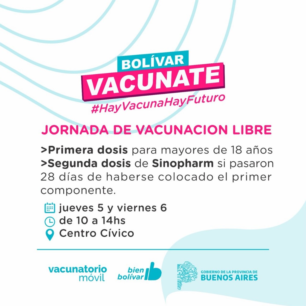El Plan Provincial de Vacunación avanza sin interrupciones en el Partido de Bolívar y debido a la disponibilidad de vacunas, se desarrollarán dos nuevas jornadas de inoculación en el Centro Cívico.