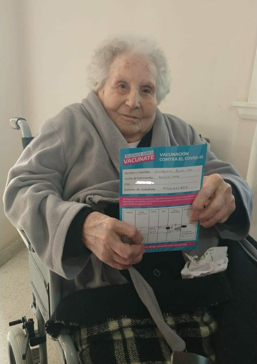BLANCA TIENE 102 AÑOS Y RECIBIÓ SU PRIMERA DOSIS DE MANERA DOMICILIARIA   El intendente Marcos Pisano puso a disposición de la comunidad el Delivery de Vacunas, con la finalidad de garantizar la aplicación domiciliaria de primeras dosis a todas aquellas personas que por diferentes motivos aún no hayan sido vacunadas; y este sábado, Blanca quien tiene 102 años fue la primera en recibir la vacuna en su domicilio.    La nueva iniciativa municipal permite al equipo de Salud del Municipio continuar avanzando con el Plan Provincial de Vacunación, para llegar a los 3.700 mayores de 18 años que no están vacunados todavía. En esta oportunidad, Blanca quien no había podido vacunarse fue la primera inoculada en el marco de este programa municipal.