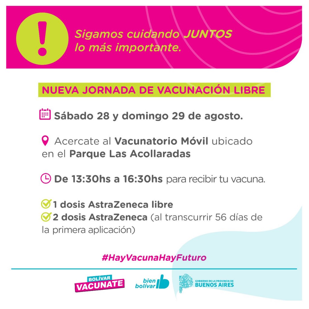 El equipo de Salud del Municipio desarrollará este sábado 28 y domingo 29, de 13.30hs a 16.30hs, dos nuevas jornadas de vacunación libre de primeras dosis para mayores de 18 años y segundas dosis de AstraZeneca, en el Vacunatorio Móvil que se instalará en el Parque Municipal Las Acollaradas.