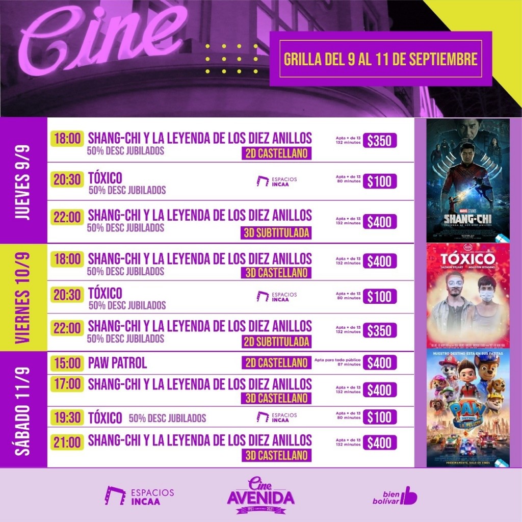 El Avenida renueva la cartelera para este jueves, viernes y sábado con la historia de un experto en artes marciales y maestro del Kung-Fu: “Shang-Chi y la Leyenda de los Diez Anillos” y el film argentino “Tóxico” que narra la historia de dos jóvenes que buscan escapar de un virus de alcance global. Continúa en cartelera “Paw Patrol: La Película”. El domingo debido al desarrollo de los comicios electorales el cine no abrirá sus puertas.