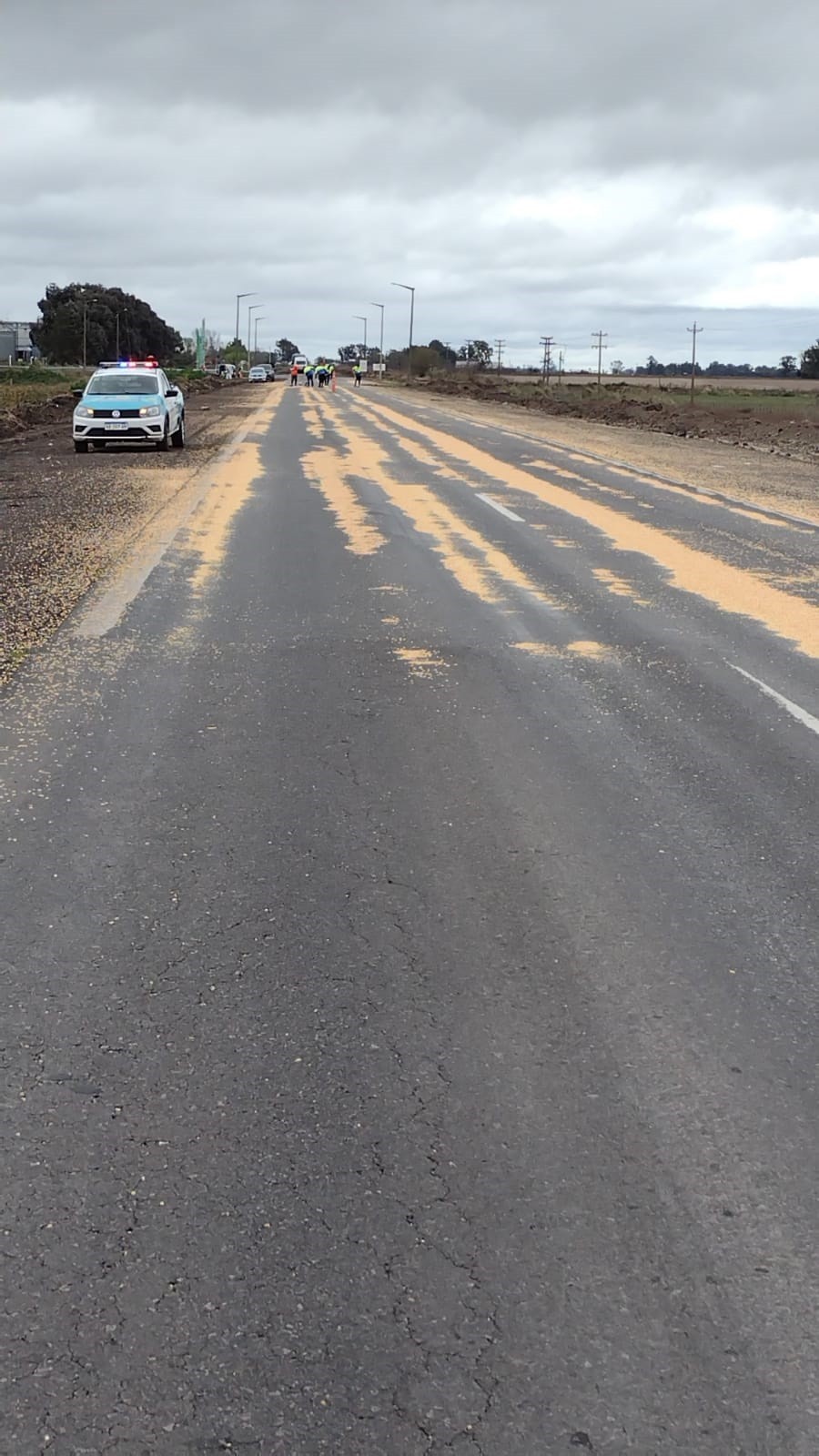 Si bien se desconoce el inconveniente que tuvo el transporte que trasladaba la carga de cereal, lo cierto es que unos cuantos kilos quedaron esparcidos sobre la ruta.